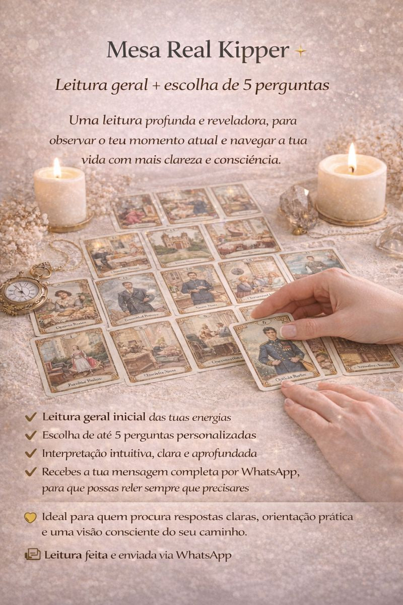A Mesa Real Kipper (Grand Tableau) é uma leitura profunda e reveladora, feita com um dos baralhos mais diretos e objetivos da cartomancia.